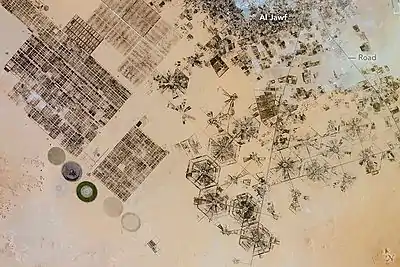 The city lies in the largest oasis in the Kufra basin,[1] extracting the water from the Nubian Sandstone Aquifer System. It is one of the most heavily irrigated oases in the Sahara. The surrounding area contains clusters of center-pivot irrigation systems used for agriculture. The distinctive pattern was photographed from orbit by the crew of the International Space Station in 2016.[2]