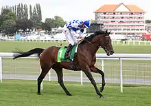 In his first race for almost a year, Al Kazeem started 9/4 favourite for the Gordon Richards Stakes at Sandown Park Racecourse. He won by a length from the Henry Cecil-trained Thomas Chippendale, despite edging to the right in the closing stages.[8] On 26 May, Al Kazeem was sent to Ireland where he was matched against the 2012 Epsom Derby winner Camelot in the Tattersalls Gold Cup. Doyle held the colt up at the back of the four runner field before moving forward in the straight. He overtook Camelot 100 yards from the finish to take his first Group One race by one and a half lengths.[9] The win gave his jockey, James Doyle, his first win in Ireland and his second at Group One level following his win on the Charlton-trained Cityscape in the 2012 Dubai Duty Free Stakes.[10] Doyle explained that Charlton had always believed that the horse would return to form, and said that "at the two-furlong pole I couldn't believe how well we were travelling – I was having to take him back."[11]