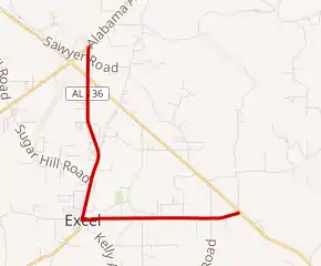 SR 136 is aligned along a two-lane road for its entire length. It begins at an intersection with SR 21 (South Alabama Avenue) just south of Monroeville. It travels to the south and intersects US 84 (internally designated as SR 12)/SR 41. It curves to the south-southwest and intersects the southern terminus of Monroe County Route 27 (CR 27; Sugar Hill Road). It then enters the small town of Excel, the birthplace of former Alabama Crimson Tide and Dallas Cowboys linebacker Lee Roy Jordan. There, it intersects both the eastern terminus of Monroe CR 23 (Excel–Frisco Highway) and the northern terminus of Monroe CR 18 (South Main Street). At this intersection, SR 136 turns left and begins traveling to the east. One block later is an intersection with the northern terminus of Monroe CR 35 (Kelly Avenue). It passes Excel Cemetery before leaving the city limits of Excel. Just after leaving Excel, the highway crosses over Corley Creek. Farther to the east is an intersection with Monroe CR 37 (Dottelle Road). It then curves to the east-northeast and reaches its eastern terminus, a second intersection with US 84/SR 41.[2]