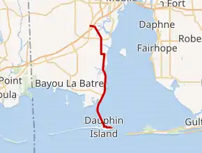 The southern terminus of SR 193 is located at the western terminus of the Fort Morgan ferry in eastern Dauphin Island. From this point, the route travels in a westerly direction before turning to the north off the island across the Gordon Persons Bridge spanning the Mississippi Sound. From this point, the route travels across Mon Louis Island, over Fowl River, and continues onward in a northerly direction, where it has a full cloverleaf interchange with I-10 at exit 17 before reaching its northern terminus at US 90 in Tillmans Corner.[2]