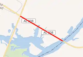 State Route 208 (SR 208) is a .839-mile (1.350 km), west–east route that serves as a connector between SR 165 and the bridge across the Chattahoochee River at Cottonton, the only bridge across the river between Phenix City and Eufaula. From its western terminus, the route continues east into Georgia as Georgia State Route 39 Spur (SR 39 Spur).[2]