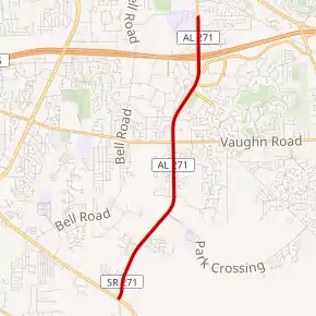 SR 271 begins at the intersection of Troy Highway, which carries US 82 (SR 6) and US 231 (SR 53), and Taylor Road. The route heads north on Taylor Road, which is a divided, six-lane street. It passes through grassland dotted with residential neighborhoods until it intersects Vaughn Road. Between Vaughn Road and Interstate 85 (I-85), SR 271 serves as a major access road for the nearby housing developments and shopping centers. It intersects I-85 with a simple diamond interchange with an additional cloverleaf loop from northbound SR 271 to southbound I-85. North of I-85, Taylor Road becomes an undivided four-lane street. The SR 271 designation ends 0.5 miles (0.80 km) north of the I-85 interchange.[1][2]