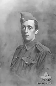 In 1914 he was working as a clerk, but he enlisted in Melbourne on 22 August 1914; the same day that he played his last match for Collingwood.[9] He was the first Collingwood footballer to enlist.[10] He served as a private in B Company of the 6th Battalion, First AIF, and embarked on 19 October 1914, aboard HMAT Hororata, for service overseas.