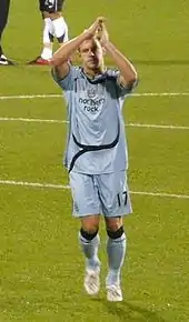 He scored only one goal in 33 appearances in 2005–06, in a 3–1 away win over Charlton Athletic.[14] On 18 February 2006, during a 1–0 defeat by Liverpool at Anfield in the FA Cup, Smith broke his leg and dislocated his ankle while attempting to block a free kick from Liverpool's John Arne Riise, an injury described by Ferguson as "one of the worst I've seen".[15] Reports at the time claimed Liverpool fans attacked Smith's ambulance as it left Anfield,[16] but Smith has since refuted these claims.[17] He had an operation the next day, after which it was estimated that he would be out of the game for around nine months.[18] A week later, Manchester United beat Wigan Athletic 4–0 in the League Cup final. After the match, Manchester United's players paid tribute to Smith by collecting the trophy in T-shirts printed with the words "For you Smudge" (Smith's nickname).[19]