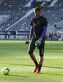 Lafont spent little more than a year in the academy at Toulouse before club manager Dominique Arribagé handed him his Ligue 1 debut on 28 November 2015 against OGC Nice.[10][11] Upon doing so, he became the youngest ever goalkeeper to play in Ligue 1 at the age of 16 years and 310 days, surpassing the record previously held by Mickaël Landreau.[12] Having replaced Ali Ahamada and Mauro Goicoechea as Toulouse's starting goalkeeper, Lafont kept clean sheets in his first two competitive fixtures before finally conceding in a 3–2 loss against Lorient on 5 December 2015. In January 2016, Lafont was named as the 34th best U-20 player in the world by Italian publication La Gazzetta dello Sport and featured as one of only two goalkeepers on the list alongside A.C. Milan's Gianluigi Donnarumma.[13] Having been 10 points adrift of safety at the time of Lafont's introduction into the first team, Toulouse managed to avoid relegation on the final day of the season, thanks in part to the eight clean sheets he kept in his 24 appearances for the campaign.[14] He was rewarded for his form on 30 June 2016 when he signed a new contract with Toulouse, extending his stay with the club until 2020.[15]