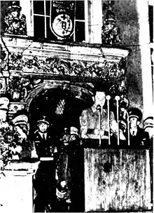 In 1939, following orders from Berlin, Forster led the agitation in Danzig to step up pressure for annexation by Nazi Germany and proclaimed that in future "Poland will be only a dream".[4] On 23 August Forster replaced Greiser as Danzig's head of state. The Danzig issue was one of the pretexts used for the Nazi invasion of Poland in 1939. He was hateful of Jews whom he called "dirty and slippery race" and he expressed his desire to control parts of Poland after Poles would be expelled from them.[5]