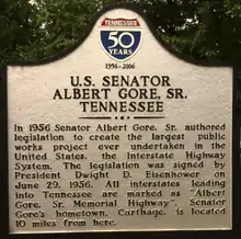 After leaving Congress, Gore Sr. resumed the practice of law and also taught law at Vanderbilt University. He continued to represent the Occidental Petroleum where he became vice president and member of the board of directors. Gore became chairman of Island Creek Coal Co., Lexington, Kentucky, an Occidental subsidiary, in 1972, and in his last years operated Gore Antique Mall, an antiques store in Carthage.[24] He lived to see his son Albert Gore Jr. become Vice President of the United States. Gore Sr. died three weeks shy of his 91st birthday and is buried in Smith County Memorial Gardens in Carthage. The stretch of Interstate 65 in Tennessee has been named The Albert Arnold Gore Sr. Memorial Highway in his honor.[6]
