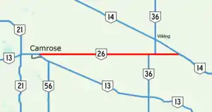 Highway 26 begins in the eastern outskirts of Camrose where it splits due east from Highway 13, which bends southeast toward Ohaton.[2] Highway 26 proceeds east along the 12th Correction Line,[2][3] first meeting Highway 834 at a T-intersection; Highway 834 becomes Highway 56 when it meets Highway 13. Highways 26 and 834 are concurrent for 5 km (3.1 mi) before Highway 834 branches off north to Round Hill. Highway 26 continues east, intersecting Highways 854, 855 and 857. Highway 26 meets Highway 36 approximately 12 km (7 mi) southwest of Viking and the two highways run concurrently for 3 km (2 mi) before Highway 36 turns north into Viking. After leaving Highway 36, the highway continues east to its end at Highway 14, approximately 4 km (2 mi) west of Kinsella.[2][4]