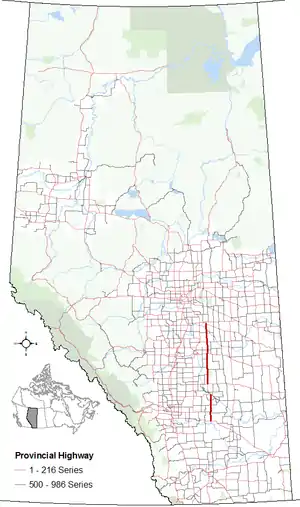 Alberta Provincial Highway No. 56, commonly referred to as Highway 56, is a north-south highway in central Alberta, Canada. It begins 20 km (12 mi) northwest of Bassano at its intersection with Highway 1 (Trans-Canada Highway). It continues through Drumheller and Stettler and before ending at intersection with Highway 13 and Highway 834 9 km (6 mi) southeast of Camrose.[2]