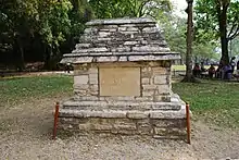 After the unexpected death of Miguel Ángel Fernández in 1945, Ruz Lhuillier took charge of the INAH's investigations at Palenque. While he served as the INAH's southern Director of Pre-Hispanic Monuments, Ruz Lhuillier excavated much of the city and restored and conserved such edifices as the Palace. In 1948, he discovered the entrance to the tomb of the Maya ruler, K'inich Janaab' Pakal, hidden beneath the Temple of the Inscriptions. After four seasons of clearing the rubble-filled stairway, he found Pakal's sarcophagus and body.[3][4] Ruz Lhuillier's team also found the Tablet of the Palace, which served as the back to a throne, and the Tablet of the Slaves which depicts a cahal amid bound captives. Ruz Lhuillier continued working at the site until 1958.