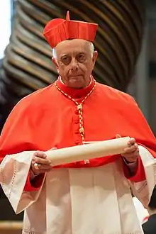 On 4 January 2015, following his weekly Angelus address, Pope Francis announced that he would make him a cardinal during a consistory to be held on 14 February.[2] At that ceremony, he was assigned the titular church of San Policarpo.[3] In April 2015 he was appointed a member of the Congregation for the Clergy and the Pontifical Council for Justice and Peace (the latter which was dissolved in 2016). He holds his membership in the former body until he turned 80 on 30 January 2019 at which point he also became ineligible to vote as an elector in a future papal conclave.