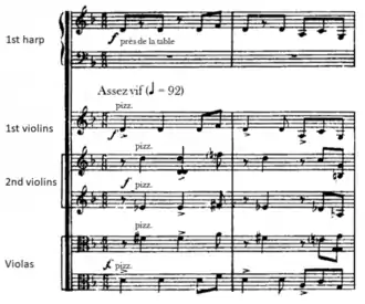 The music consists of two sections of lively dance music, separated by a rhapsodic, extended song.[18] The opening is marked assez vif (fairly quick), ♩ = 92.[19] Like the piano original, the piece begins with imitations of guitar music. In the orchestral version they are produced by the first harp, played close to the sound board, along with precisely arranged pizzicato violins and violas.[20] The basic metre of the opening section is 6