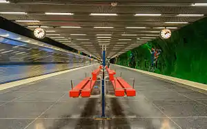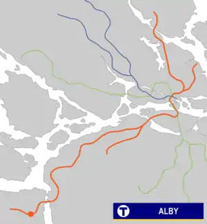 Alby metro station is a station characterized by the colorful art work inspired by the local petroglyphs. The station is located in Alby, Botkyrka Municipality, on the red line of the Stockholm metro. The station was opened on 12 January 1975 as part of the extension from Fittja to Norsborg.[2] It is 19 km away from Slussen.
