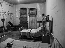 The penitentiary hospital was established on June 14, 1934. It provided medical and dental service to inmates, prison personnel, Lighthouse Service employees, and to civilians on the island.[4] The hospital was situated on the floor above the dining room. It contained three large wards with five hospital beds each, two isolation wards, a treatment room, surgery room, and a supply room, a doctor's office, dentists office, and chief Medical Technical Assistant's (MTA) office, plus a kitchen, and a bathroom with toilet and shower.[5]