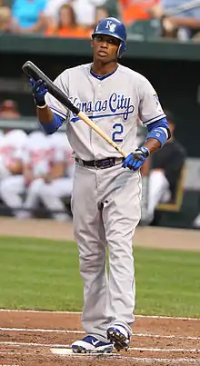 During the 2015 ALCS, Escobar set a postseason record by getting a leadoff hit in four consecutive games. He was selected as the 2015 ALCS MVP as he batted .478 in the series.[21] In Game 1 of the 2015 World Series, Escobar hit an inside-the-park home run on the first pitch thrown by the New York Mets' Matt Harvey.[22] It was the first time a player had hit an inside-the-park home run in a World Series game since 1929. He followed that by driving in two runs and scoring once on two hits in Game 2.[23] In Game 5, Escobar hit a double in the 12th inning allowing Christian Colon to score to help the Royals defeat the Mets 7–2 in 12 innings making the 2015 Kansas City Royals World Series Champions. In the 2015 postseason, Escobar hit .329 in 70 at bats. He had 23 hits including four doubles and three triples, 13 runs scored, and 9 RBI.[24] He was awarded the 2015 Rawlings AL Gold Glove for shortstops.[25]