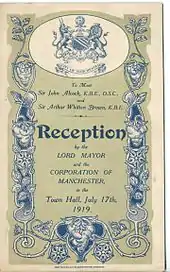 Alcock and Brown flew to Manchester on 17 July 1919, where they were given a civic reception by the Lord Mayor and Corporation, and awards to mark their achievement.