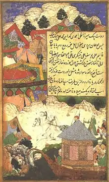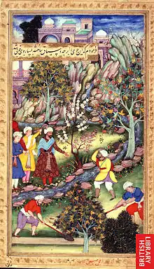 Afghanistan currently has about 60,000 hectares (150,000 acres) of areas cultivating grapes and excellent climate and terroir suitable for quality wine.[5] While the history of wine goes back much longer, viticulture seems to have been well established in parts of Afghanistan by at least the fourth century BC.[6] It is said that Babur, the first Mughal emperor, learned about wine in Kabul.[7] His autobiographical memoirs, the Baburnama, is said to mention especially neighboring Istalif (the name possibly derived from Greek staphile, grape), "with vineyards and orchards on either side of its torrent, its waters cold and pure".[7] The Mughal Empire received high quality wine from the Indus valley and Afghanistan.[8] Medieval times saw a comparably flourishing wine production, which was ended in the 18th century.[5] The 1960s saw trials to restart production, which was ended by the Taliban. Around 1969, a French survey estimated that (larger) vineyards covered about 37,500 hectare and 2% of the arable land.[9] The largest part of vineyards was close to Herat, Kandahar and Kabul; smaller areas have been found on the northern border.[9] The French survey has focused on the largest professional vineyards, but mentions grapes being grown in various gardens, even at 2,400 m altitude in Nuristan Province.[9] A 1968 estimate related to a local aid program came to 60,000 hectares (150,000 acres) overall.[10] By comparison, Austrian wine is grown in an area of about 51,000 hectares (130,000 acres).[11] The main current production is around Kabul and goes – for religious reasons – mostly into juice and raisins.
