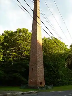 The history of Alcove is a history of the mills established along the Hannacroix (Haanacrois) Creek. In 1790, an early settler by the name of Casperus Ackerman established the first mill in the area.[2] In 1844, Ephraim Andrews established the Valley Mill for carding of wool and cloth manufacturing along the Hannacroix Creek at the corners of what is now New York State Route 143 and Albany County Route 111.[2][3] It would be expanded in 1848 and converted to the manufacturing of straw paper by John E. Andrews, and in 1854, in partnership with WS Briggs, improvements such as steam power were introduced. WS Briggs and Sons was formed as a partnership in control of the mills in 1871, with Briggs' son Amos D. Briggs as proprietor. This partnership would buy other local mills as well, including Ephraim Andrews'. An early name for Alcove was Stephensville, named for Archibald Stephens, who at one time owned the Andrews' mill prior to selling it to WS Briggs and Sons. When the post office was established in the hamlet in 1881, it took the name Alcove.[2] The Valley Mill was destroyed by fire in 1892 leaving the 110-foot-tall (34 m) chimney as the only remnant. The chimney is on the National Register of Historic Places and, along with 140 acres (0.57 km2) of the hamlet,