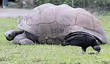 This is a controversial subspecies possibly distinct from the Aldabra giant tortoise. The subspecies is a morphologically distinctive morphotype, but is considered synonymous with that species by many researchers. This identification is based primarily on morphological characters. Published molecular identifications are unclear with several different indications provided by different data sources.[6] Captive-reared juveniles suggest that there may be a genetic basis for the morphotype and more detailed genetic work is needed to elucidate these relationships. The subspecies is the only living saddle-backed tortoise in the Seychelles islands. It was apparently extirpated from the wild but recently purportedly rediscovered in captivity. The current population of this morphotype is 24 adults, including 18 adult males in nonbreeding captive groups on Mahé Island. Successful captive breeding has produced numerous juveniles.[7][8][9]