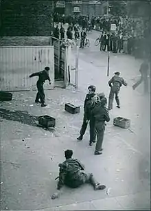 The rioters returned again on the evening of 5 July and gathered in Princes Gardens before marching on Union Street, where they threw bricks and stones at cars, smashed the remaining undamaged shop windows, threatened shopkeepers and broke into a brewery where they helped themselves to the stock.[1] The Canadian Military Police tried to forcibly quell the riot, which continued for more than two hours, ending around midnight. A Canadian officer who tried to send them back to their barracks told them, "You are giving Canada a bad name. Canadians are getting a fair share of boats but the shipping position is most difficult."[2] In total about £10,000 in damages was caused over the two evenings.