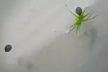 Aldrovanda vesiculosa is a rootless aquatic plant. Seedlings develop a short protoroot; however, this fails to develop further and senesces. The plant consists of floating stems reaching a length of 6–40 cm (2–16 in).[5][7] The 2–3 mm (1⁄16–1⁄8 in) trap leaves grow in whorls of between 5 and 9 in close succession along the plant's central stem. The actual traps are held by petioles which have air sacs that aid in flotation. One end of the stem continually grows while the other end dies off. Growth is quite rapid (4–9 mm (3⁄16–3⁄8 in) per day in Japanese populations[8]), so that in optimal conditions a new whorl is produced once or more each day.