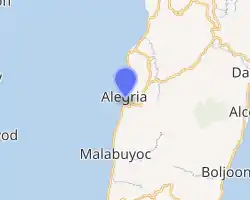 Alegria, officially the Municipality of Alegria (Cebuano: Lungsod sa Alegria; Tagalog: Bayan ng Alegria), is a 4th class municipality in the province of Cebu, Philippines. According to the 2020 census, it has a population of 25,620 people. [3]