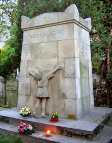 Prus's tomb was designed by his nephew, the noted sculptor Stanisław Jackowski. On three sides it bears, respectively, the novelist's name, Aleksander Głowacki, his years of birth and death, and his pen name, Bolesław Prus. The epitaph on the fourth side, “Serce Serc” (“Heart of Hearts”), was deliberately borrowed from the Latin “Cor Cordium” on the grave of the English Romantic poet Percy Bysshe Shelley in Rome's Protestant Cemetery.[68][69] Below the epitaph stands the figure of a little girl embracing the tomb — a figure emblematic of Prus's well-known empathy and affection for children.[70][71]