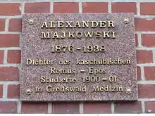 Aleksander Majkowski (Kashubian: Aleksander Majkòwsczi; 17 July 1876 – 10 February 1938) was a Kashubian writer, poet, journalist, editor, activist, and physician. He was the most important figure in the Kashubian movement before World War II. He was the editor of "Gryf" (The Griffin) and author of the greatest Kashubian novel Żëcé i przigodë Remusa ("The Life and Adventures of Remus"), and The History of the Kashubs.