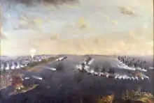 With the outbreak of the Russo-Swedish War in 1788, Bibikov volunteered to enter the corps of Lieutenant-General Ivan Michelson, who had served with Bibikov's father and now took the younger Bibikov under his patronage.[1] In the Swedish campaign, Bibikov participated in the reconnaissance of the Swedish outpost at Gokforsky around the village of Kiro, near Wilmanstrand. In a subsequent engagement at the village Bibikov and two grenadiers captured a Swedish cannon. In preliminary operations around Porrassalmi on 1 June 1789, he was wounded in the left leg by a bullet, and in the Battle of Porrassalmi Bibikov commanded a company and was again wounded.[1][4] For bravery in action he was awarded the Order of St. George Fourth Class on 9 June 1789.[2] He was again in action on 9 July 1789, clashing with Swedish forces as they passed through Kyumen towards Memele, and again at Memele on 29 July. Bibikov then joined the Russian galley fleet, under Vice-Admiral Karl Heinrich von Nassau-Siegen, and distinguished himself at the Battle of Rochensalm in August 1789, and at the disembarkation at the mouth of Kymi on 21 August, where he commanded a battalion of the Preobrazhensky Regiment. For these latter actions he was on 30 August 1789 awarded the ceremonial Golden Sword "For Bravery".[1][4]