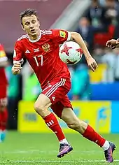 On 11 May 2018, he was included in Russia's extended 2018 FIFA World Cup squad.[17] On 3 June 2018, he was included in the finalized World Cup squad.[18] On 14 June 2018, he played a crucial role in Russia's 5–0 victory over Saudi Arabia making two assists and scoring the final goal, a free-kick in the opening match of the 2018 World Cup.[19]
