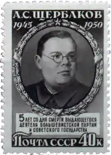 Aleksandr Sergeyevich Shcherbakov (Russian: Алекса́ндр Серге́евич Щербако́в; 10 October [O.S. 27 September] 1901 – 10 May 1945) was a Soviet politician and statesman who was a wartime head of the Political Directorate of the Red Army as well as the director of the Soviet Information Bureau.