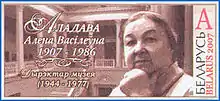 To commemorate the centenary of her birth, Aladava was featured on the 1 and 10 ruble coins.[8][9][10] She was also featured on a commemorative stamp.[11]