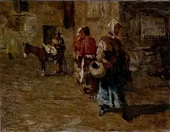 Lupo developed artistically under the guidance of Vittorio Cavalleri, and also attended night courses at the Accademia Albertina.[1] He worked within the tradition of late 19th-century Piedmontese Naturalism, influenced in his landscapes by the works of Delleani. His debut at the Turin Società Promotrice di Belle Arti in 1901 with three studies from life was followed by regular participation in the major national events. Though criticised for excessive adherence to the models of his master, his work attracted the attention of the public and critics from 1908 on. The early landscapes painted en plein air gave way to a broader range of subjects until he began to specialise in market scenes and animals during the 1920s. The artist’s success in terms of exhibitions and reviews, beginning with the solo show of 1921 at the Galleria Vinciana, Milan, came to an abrupt end when he was excluded from the Venice Biennale of 1928. He continued to exhibit, however, abroad. Long-term commercial success was nevertheless ensured by the pleasant character of the subjects addressed and a penchant for outmoded 19th-century stylistic mannerisms.