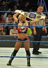 Having no prior wrestling training, Kaufman was signed by WWE in May 2013 and reported to WWE's developmental territory NXT.[13] On July 24 episode of NXT (which was taped on June 20), she made her first televised appearance, congratulating the inaugural NXT Women's Champion Paige.[14] In August, she was added to WWE.com's NXT roster page and assigned the ring name Alexa Bliss.[15][16] She acted as an unnamed ring announcer for the November 20 episode of NXT.[17][18] Her first televised appearance on the main roster came at WrestleMania XXX on April 6, 2014, when she played a part in Triple H's entrance.[19][20] She made her televised in-ring debut on May 8 episode of NXT, playing a glitter fairy gimmick with her ring entrance set to the theme track "Bling Bling," competing in a tournament for the vacant NXT Women's Championship.[21] She defeated former Divas Champion Alicia Fox in the first round, but lost to Charlotte in the semi-finals.[21][22][23] On September 25 episode of NXT, a new ring entrance theme track "Blissful" was debuted for the first time with her match against Bayley. After a failed Double-Knees attempt, Bliss lost to a Bayley-to-Belly Suplex.[24][25]