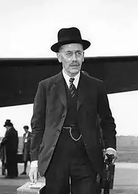At the end of the First World War, he served at the Versailles Peace Conference. In 1923, he became the head of the League of Nations section of the Foreign Office and remained quite optimistic about the prospects for the League. He was less confident about the prospects of success for the Disarmament Conference in Geneva and became quite frustrated at the lack of trust necessary for joint disarmament.[7] Performing this work, he developed an appreciation for his colleague and superior, Anthony Eden. Cadogan found him agreeable, and in a 1933 letter to his wife, he wrote, "He seems to me to have a very good idea of what is right and what is wrong, and if he thinks a thing is right he goes all out for it, hard, and if he thinks a thing is wrong, ten million wild hordes won't make him do it."[8] Eden returned the admiration, writing that Cadogan "carried out his thankless task with a rare blend of intelligence, sensibility, and patience."[8]