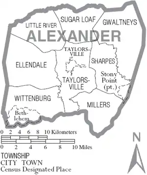 The population of cities, towns, and Census Designated Places (CDP) is shown in the following table is based on the 2010 census of Alexander County.[20]