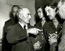 Before the war, MacGowan won a Selfridge Award in 1932 for an article about Devil's Island in The Times.[5] Later, he covered the coronations of King George VI and Queen Elizabeth II, the Spanish Civil War, and spent time in Morocco with the French Foreign Legion (1937).[6] During World War II, MacGowan continued writing for The Sun, covering the Battle of Britain, the disastrous Dieppe raid (in which he wrote about dive bomber strafing and depth charges around his ship). Reporting later from North Africa, Ernie Pyle referred to him as the "oldest" correspondent there, fearlessly popping up from his foxhole to interview soldiers between incoming rounds.[7] After the defeat of Rommel in Africa, MacGowan transferred to Italy, and in 1944 covered the D-Day landings in northern France. On 15 August 1944, he had one of his closest brushes with death as he was captured, along with a couple of other correspondents, by two German light tanks firing machine guns at them. His friend William Makin, on the jeep with him, was critically wounded.[8] MacGowan's capture was reported in daily newspapers in London, New York and elsewhere around the world. The headline in The New York Times read, "MacGowan of Sun Captured in France; Nazis Report Companion Hurt in 'Scrape'".[9] A couple of days later, he eluded his captors by leaping from a prisoner-of-war train in the middle of the night. In April and May 1945 he gave The Sun eyewitness reports of the liberation of the Buchenwald and Dachau death camps.