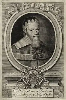 On 10 July 1621 Gibson was appointed a lord of session, and took the title of Lord Durie, his clerkship being conferred on his son Alexander, to be held jointly with himself. Sir Robert Douglas, 6th Baronet stated that Gibson was created a baronet of Nova Scotia in 1628, but he does not appear to have used the title.[1]