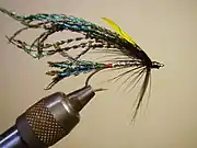 The Alexandra wet fly originated in Scotland in the 1860s. The artificial fly is also known as the Lady of the Lake, the fly was named by English angler Major William Greer Turle to honor Alexandra, Princess of Wales. The fly is distinguished by the heavy peacock herl wing and silver body which makes the fly resemble a small baitfish or fry. The Alexandra proved to be a very effective fly for trout in lakes and streams in England and Scotland in the late 19th and early 20th century. Many fly fishing purists derided the fly and its use was once banned on many English waters.