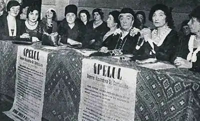 Cantacuzino immersed herself in the struggle for electoral emancipation, lobbying for women's right to vote and run in elections for urban and rural citizens' councils. To this goal, she created in 1929 an Association of Romanian Women (Gruparea Femeilor Române, GFR), of which she became President, while preserving control over CNFR and the smaller Solidaritatea.[71] One of the GFR's main goals, cemented in its charter, was "an active propaganda work, oral as well as written, among the feminine masses"; another one was the setting up of Initiative Committees for female representation.[72] However, the GFR remained highly centralized, and no clear criterion for admitting or rejecting membership was ever recorded in its statutes. Political scientist Alexandra Petrescu finds that the GFR, a "matriarchal" order, mimicked the "masculine hierarchy" of traditional political parties, effectively subverting the democratizing process of first-wave feminism.[72]