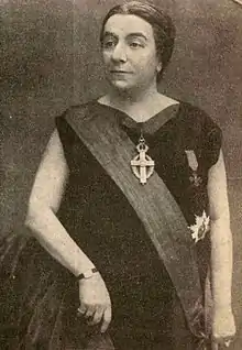 From 1925 to 1936, with a CNFR mandate, Cantacuzino served as Vice President of the International Council of Women (ICW), and, as such became Romania's best-known feminist.[66] She was one of the European delegates to ICW's 1925 Conference in Washington, D. C..[67] By 1926, her distinctions included the Grand Cross of Queen Marie, the Order of the Holy Sepulchre (Collar), the Order of St. Sava (Great Officer), the Croix de guerre (Officer) and the Croce al Merito di Guerra (Officer).[63] She was IWC delegate at the League of Nations in 1927, and again in 1933, as well as IAWSEC rapporteur to the same international body (1926, 1928, 1933).[62] Drifting apart from both the LDDF and AECPFR, who accused her of using feminism to advance her own "internationalist" goals, Cantacuzino presided upon Solidaritatea ("Solidarity"), her very own feminist sorority, enlisting it with IAWSEC as a separate body.[68]