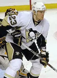 On 2 March 2010, Ponikarovsky was traded to the Pittsburgh Penguins in exchange for Luca Caputi and Martin Škoula.[5] Following the trade, he remained optimistic he would resume contract talks with Toronto in the off-season.[6] In his debut game with the Penguins on 6 March 2010, against the Dallas Stars, he scored his first goal with his new team.