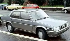 Designed by Bertone and introduced at the 1984 Turin Motor Show, the 90 was pitched between the Alfa Romeo Giulietta (nuova) and the Alfa Romeo Alfa 6, both of which were soon discontinued after the 90's launch. The car used the Alfetta chassis (including its rear mounted transaxle) and took its engines from the larger Alfa 6. The bodywork was similar to both, albeit modernised. One notable feature of the 90's design was a small chin spoiler which extended above a certain speed to aid engine cooling.[1] Its angular lines with integrated bumpers gave the car a neat look consistent with the period, however the aerodynamics suffered with a drag coefficient of Cd=0.37. The cars design was conservative, inside and out, with perhaps the only unusual element being the U-shaped parking brake lever.[2]