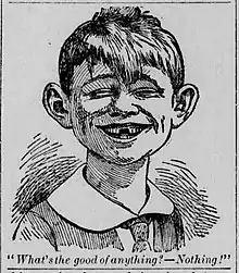 A description of the stage play's advertisement was published in the December 2, 1894, Los Angeles Herald. Using words that could easily be describing the character of Alfred E. Neuman, the paper reported that the "comic red-headed urchin with a joyous grin all over his freckled face, whose phiz [face] is the trademark of the comedy, is so expressive of the rollicking and ridiculous that the New York Herald and the Evening Telegram have applied it to political cartoon purposes."[21] Elements of the plot of the play explain why the character has adult and childlike features, why the character is dressed as he is, and how he may have lost his teeth.[21] The original New Boy image was published with a two-part phrase that is similar in tone to Neuman's, "What? Me Worry?" catch phrase: "What's the good of anything? – Nothing!"[21]