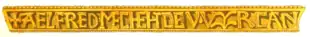 The Alfred Jewel is about 2+1⁄2 inches (6.4 cm) long and is made of filigreed gold, enclosing a highly polished tear-shaped piece of clear quartz "rock crystal", beneath which is set a cloisonné enamel plaque, with an image of a man, perhaps Christ, with ecclesiastical symbols. The figure "closely resembles the figure of Sight in the Fuller Brooch, but it is most commonly thought to represent Christ as Wisdom or Christ in Majesty", according to Wilson,[8] although Webster considers a personification of "Sight" a likely identification, also comparing it to the Fuller Brooch.[10] Around the sides of the crystal there is a rim at the top that holds the rock crystal in place, above an openwork inscription: "AELFRED MEC HEHT GEWYRCAN" (Ælfred mec heht ġewyrċan, [ˈælv.red mek hext jeˈwyrˠ.t͡ʃɑn]), meaning "Alfred ordered me made".