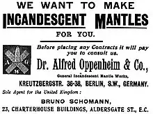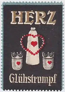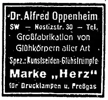 After finishing his work for the joint-stock company, he founded (1910/1911), again trading under its own name, another factory called Dr. Alfred Oppenheim, which was connected with a chemical laboratory.[8] The company mainly supplied government agencies and was well known for its railway lighting products. Mid-1930s there were about 100 people employed.[9] The company's focus was the manufacture of gas mantles. The best-known product was a trademark called Herz (Heart), that was produced in different versions.[10] Further lamps had proprietary names such as Edelstein (Jewel), Topas (Topaz), and Veilchen (Viola). But also chemical and pharmaceutical products were manufactured, for example Self-filtering Tablets.[11]