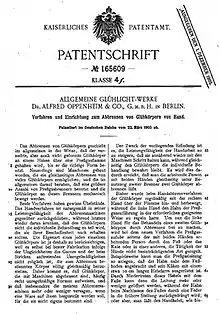 - Kaiserliches Patentamt, patent no. 165609: Verfahren und Einrichtung zum Abbrennen von Glühkörpern von Hand. class 4f, patented on 22 March 1905, published on 1 December 1905, applicant: Allgemeine Glühlicht-Werke Dr. Alfred Oppenheim & Co., G.m.b.H.