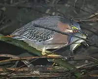 In 2006, a male and female California golden beaver arrived in Alhambra Creek in downtown Martinez.[5] The beavers built a dam 30 feet (9 m) wide and at one time 6 feet (2 m) high, and chewed through half the willows and other creekside landscaping the city planted as part of its US$9.7 million 1999 flood-improvement project. The City Council wanted to remove the beavers because of fears of flooding, ironically, as the worst flood since the flood control project was in 2005, two years before the beavers came. Local residents organized to protect them, forming an organization called Worth a Dam.[6] Resolution included installing a flow device pipe through the beaver dam so that the pond's water level could not become excessive. Now protected, the beaver have transformed Alhambra Creek from a trickle into multiple dams and beaver ponds, which in turn, led to the return of numerous birds, steelhead trout (Oncorhynchus mykiss) and river otter (Lontra canadensis) in 2008, and mink (Neogale vison) in 2009.[7][8] Examples of the impact of the beaver as a keystone species in 2010, include a green heron (Butorides virescens) catching a tule perch (Hysterocarpus traskii traskii), the first recorded sighting of the perch in Alhambra Creek and the December arrival of a pair of hooded mergansers (Lophodytes cucullatus) (see photos). The beaver parents have produced babies every year since their 2006 arrival.[9] However, in June, 2010, after birthing and successfully weaning triplets this year (and quadruplets the previous three years), "Mom Beaver" died of natural causes.[10]