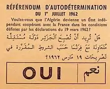 During the 1962 Algerian independence referendum crowning the Algerian revolution on March 19, 1962, 107-year-old Sheikh Ali Boushaki headed to the voting booth of the Thénia boys' school where he voted for independence as the centenary dean of Algerian voters.[33]
