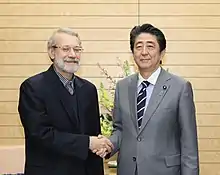 Larijani implied on 21 June 2009 that authorities took the side of one candidate, without clarifying which candidate.[22] Just after the election, Larijani reportedly congratulated presidential candidate Mir Hossein Mousavi as he, having "access to firsthand and classified information and news", believed Mousavi had won the election.[23] However, on 22 October 2012, during a QA meeting with the students of Iran University of Science and Technology, Larijani denied the allegations that he had congratulated Mousavi.[24] He was elected as speaker in the new Majlis in May 2016.[25]